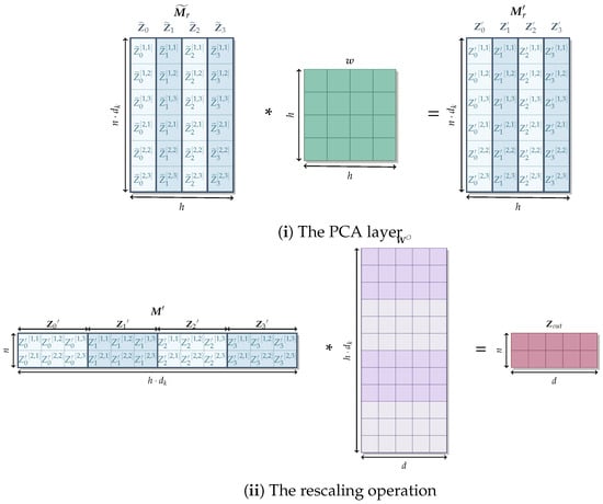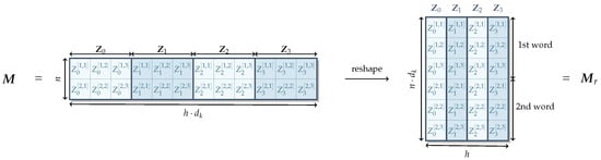 In order to incorporate the PCA layer into the Transformer architecture, we first need to reshape the concatenated multi-head attention matrix M into . This operation is illustrated in Figure 1. From Equation (6), we find that each row of the matrix M is defined as follows: