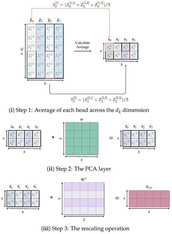 The average architecture. These figures show the average architecture. (i) shows the operation that calculates the average of each head across the dimension as defined in Equation (26) in order to obtain matrix , where , and for illustrative purposes. (ii) shows the operations involved in the PCA layer, where S is multiplied by to obtain (Equation (28)). (iii) shows the rescaling operation (Equation (30)) where is multiplied by in order to be rescaled to with .