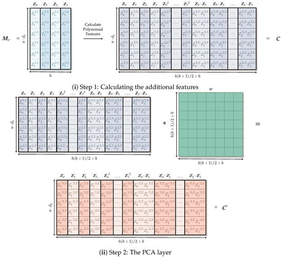 The non-linear architecture (cont’d). These figures illustrate the non-linear architecture. Figure 4i (see the previous page) shows how the augmented matrix is obtained from matrix , where , and for illustrative purposes. Figure 4ii shows the operations involved in the PCA layer (Equation (33)), where the normalized augmented matrix is multiplied by to obtain (Equation (33)). Following this, (i) shows the reshaping operation that takes as input the matrix and outputs . Finally, (ii) shows the rescaling operation (Equation (35)), where is multiplied by in order to be rescaled to with .