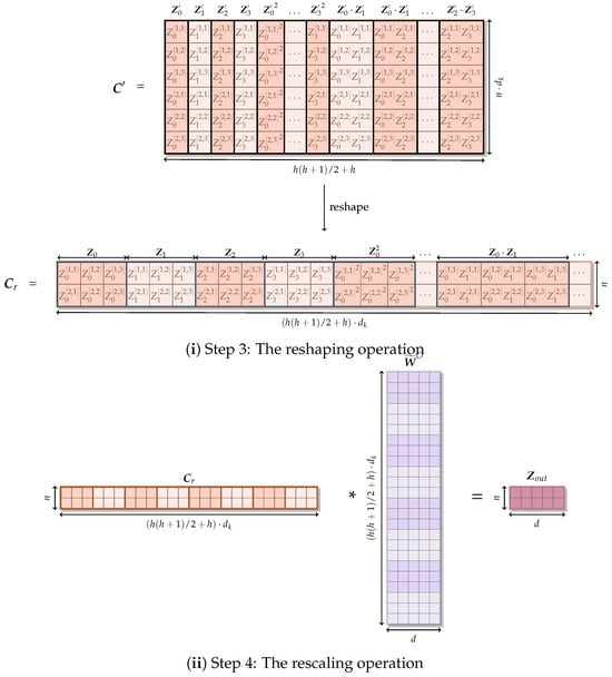 where . The dimensionality of depends directly on the selection of m; therefore, the size of the model may be either larger (if ) or smaller (if ) than the baseline Transformer architecture. The rescaling operation is illustrated in Figure 5ii.