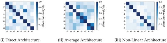 Finally, for this dataset, Figure 6iii shows the correlation matrix of the PCA layer’s weights for the Non-Linear-8 architecture. From this figure, we can see that almost all of the off-diagonal elements are very close to zero; therefore, the weights of the PCA layer have been almost perfectly aligned with the principal components. The Non-Linear-8 architecture had initially increased feature dimensionality compared to the other architectures. However, by returning only 8 out of 44 heads, we performed simultaneous dimensionality reduction. By doing this, we automatically discarded the heads that were correlated with each other, which contained redundant information. As a result, the projected heads were completely uncorrelated. However, achieving this maximum alignment between the weights and the principal components hindered the minimization of the cost function, but it did not diminish the validation accuracy or the BLEU score, as shown in Table 3.