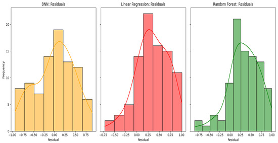 Distribution of residuals for BNN predictions. This histogram illustrates the distribution of prediction errors for the BNN. The x-axis indicates the difference between actual and predicted HbA1c values, while the y-axis reflects the frequency of these errors. A peak around zero implies strong predictive performance.