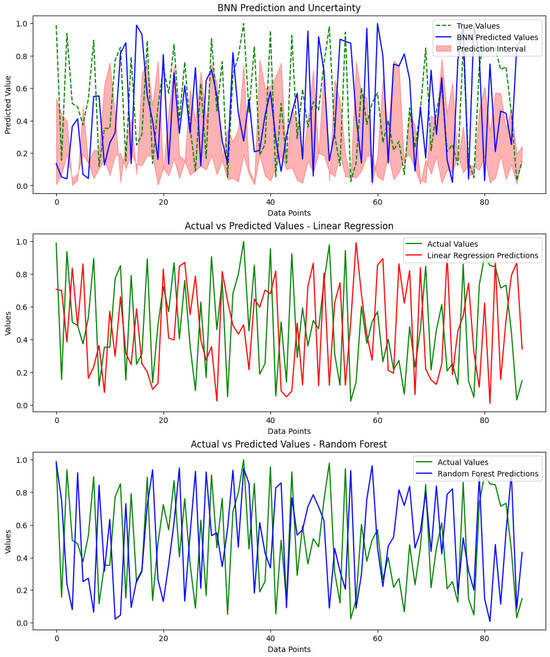 The performance of the BNN was juxtaposed with that of a traditional feedforward neural network (FNN) and a linear regression model, utilizing key performance metrics, including the Root Mean Square Error (RMSE), Mean Absolute Error (MAE), and Prediction Interval Coverage Probability (PICP). See Figure 1, Figure 2, Figure 3 and Figure 4.