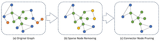 Sparse Nodes, along with their associated edges, are removed from the graph, which leads to a reduction in the graph’s overall size and complexity. The sets of remaining nodes and edges after this removal are denoted by and , respectively: