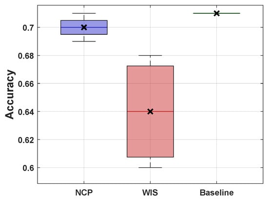 Distribution of obtained accuracy through NCP, WIS, and baseline.