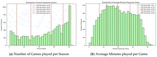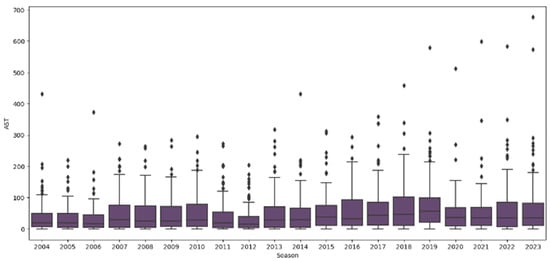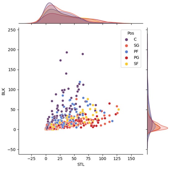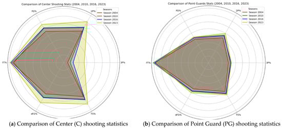 Figure 15a shows that players in the C position have significantly improved their long-range shooting percentages (3-point) over time. This improvement reflects the evolution of team strategies and the increasing demand for better positional shooting. On the other hand, as shown in