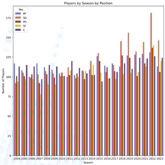 Before executing the different models, it is important to mention the columns that have been removed from the dataset. The initial stage involved removing the columns ‘Player-additional’, ‘Player’, ‘index’, ‘Season’, ‘MIN/G’, ‘G’, ‘GS’, and ‘MP’, as they provided player characteristics that are not relevant to the game statistics. For example, minutes or games played were not selected to be used for the position predictions. The column used as the label was ‘Pos’. Therefore, the final dataset consists of thirty-three (33) features.