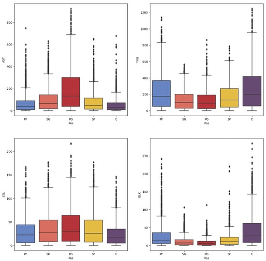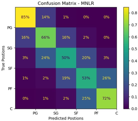 Figure 9, this model demonstrated higher accuracy in predicting the PG and C positions. Moreover, in the MNLR model, the top five features are TRB36, AST36, AST, DRB, and TRB. This may explain why the model achieved higher accuracy in predicting PG and C positions, while being less effective with the remaining three positions.