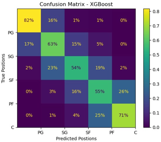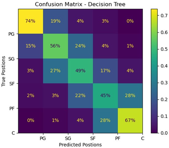 Figure 6 shows the confusion matrix for the decision tree. It seems that PG and C predictions have better results, while the remaining three positions (SG, SF, and PF) varied in mid-levels.