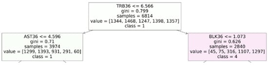 Figure 13), we notice that the weighted metrics of per-36 min played a crucial role in the decision-making process. It seems that the top five key features were TRB36, AST36, BLKS36, STL/PF, and PTS36. TRB36 is the main feature of the model, as it is used by the first node when the model tries to allocate players to their positions. This can be seen in