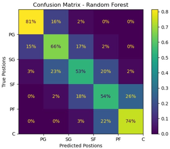 Figure 8) demonstrates that the model predicted well for three out of five positions: PG, SG, and C. This follows a similar trend to the DT algorithm. On the RF model, the top five features were TRB36, AST36, BLK36, AST/TO, and 3PA, as shown in