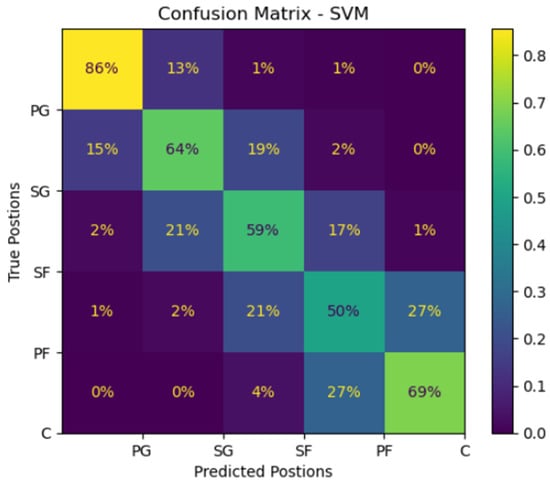 Figure 13 includes the corresponding Feature Importance plot. It seems that PG and C were easier to identify compared to other playing positions. Furthermore, the top five features for the SVM model were AST36, TRB36, FG%, BLK, and BLK36. This aligns with the importance of playmaking, rebounding, shooting accuracy, and defensive ability in determining player positions.