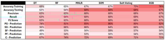 Figure 14, cells highlighted in a darker color indicate the best-performing model for each metric. Upon evaluation, it becomes evident that the soft voting classifier is the top performing model. This highlights the effectiveness of combining and integrating various conventional models into a single voting class, resulting in slight improvements over the others.