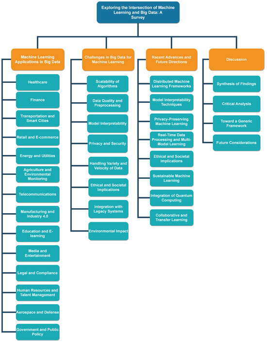 To provide a clear roadmap for the topics explored in this study, Figure 1 offers a visual overview of the key themes and their interconnections. This figure reflects the structure of the study and serves as a guide for the subsequent literature review, ensuring a comprehensive and cohesive exploration of ML applications and challenges in big data. More specifically, the remainder of this paper is structured as follows. Section 2 focuses on ML applications in big data. Section 3 explores the challenges associated with the use of big data with ML. Moreover, Section 4 notes recent advancements and future directions. Section 5 provides a discussion of the subject under consideration. Finally, Section 6 summarizes the findings of this survey.