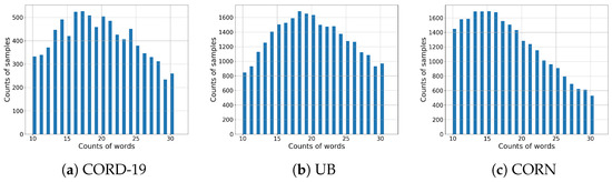 Distributions of texts between 10 and 30 word counts by dataset.