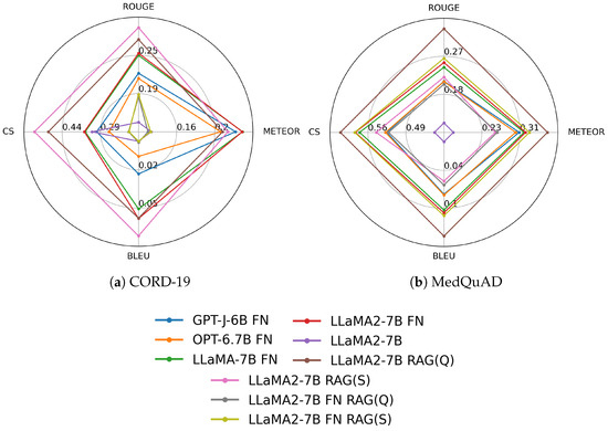 The best result for the test dataset was obtained using the RAG Llama-2-7b base model with the dataset. The best approaches’ results are ROUGE 0.3, METEOR 0.25, BLEU 0.07, and CS 0.55. The best setup is presented in detail in Figure A7.