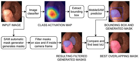 In this paper, we propose using CAMs as both prompt and filtering mechanisms with the SAM foundational image segmentation model. For this, we needed a dataset containing class-annotated images and a classification model to train on this dataset. Further, we needed an image segmentation dataset to compare our method’s results. We used GastroVision [