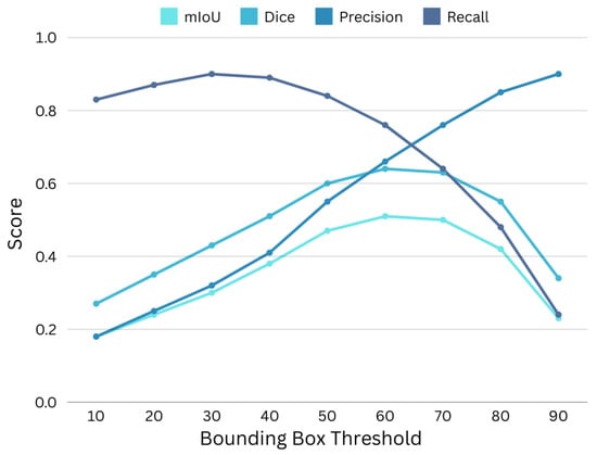 Figure 4 shows the graph of mIoU, dice, precision, and recall scores for each bounding box threshold. We can see a clear peak at about the 65% threshold where precision and recall meet. It also shows that the precision is more accurate with smaller bounding boxes due to the SAM generating smaller masks, which overlap more with the ground truth mask. With bigger bounding boxes, masks are more likely bigger than the ground truth mask, reflecting higher recall.