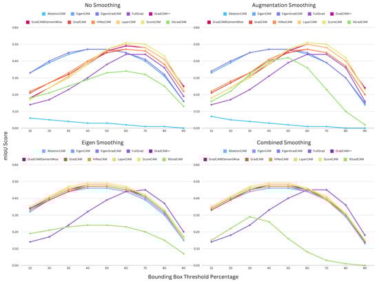 Figure 5. We see that the CAM method and smoothing techniques selected significantly impact the results. Augmentation smoothing seems to have little impact, only nudging the results. Considering the time cost, it seems too little of an impact to be added to any pipeline. However, adding eigen smoothing has a large impact on the results. For the highest-scoring methods, such as ScoreCAM, we see that the best bounding box threshold changes from around 60% to 70% to about 40% to 50%. However, this also decreases the mIoU by around 0.03 mIoU, which is not very much but could be meaningful in certain applications. Further of note is that some methods have a bigger impact from smoothing than others. In particular, AblationCAM performs a lot better with eigen smoothing than without it.