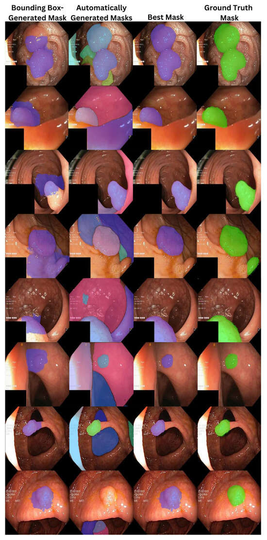 The SAM in default auto-generation mode, filtered on CLIP with the text prompt “polyp”.