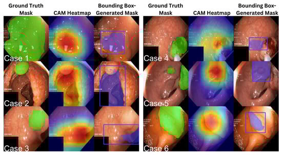 Figure 7, we show the ground truth mask, CAM, and bounding box with the SAM-generated mask for each case. Each case in the figure is explained below by the case number: