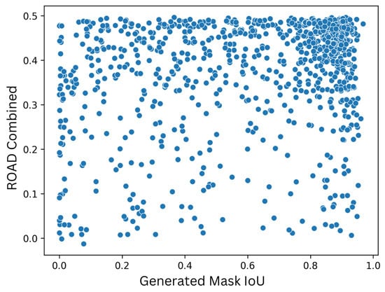 Figure 8 shows the ROAD combined score plotted against the IoU calculated for each image for ScoreCAM with augmentation smoothing and bounding box threshold 0.62 compared with the corresponding ground truth mask from Kvasir-SEG. The hypothesis was that a higher ROAD score would lead to a better mask. However, the Pearson correlation coefficient between mask IoU and ROAD combined scores was