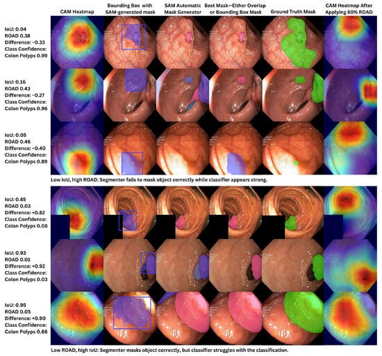 Figure 9 the case where we have a low ROAD score but a high IoU score. In this case, the classifier struggles with deciding the correct class but still helps the SAM produce an accurate segmentation mask. We see in the first and second rows of this second case that the classifier’s confidence is very low for colon polyps. So, when we create a CAM with this as our target value, the CAM is forced to activate on the part it associates with polyps, and we still end up with an accurate CAM. However, the ROAD combined score is low because removing the activated part of the CAM will cause the confidence to stay low, and small changes to the confidence result in a low ROAD score. In this case, the ROAD combined score does not accurately represent the CAM. The final image shows a CAM that covers only part of the large polyp. The SAM is able to create an accurate mask, but removing the CAM still exposes big parts of the polyp, which means the confidence of the classifier remains high, and we end up with a low difference and, therefore, a low ROAD score.