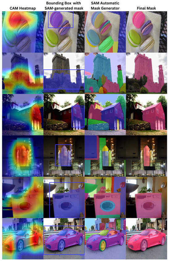 We time-tested the generation of masks using both the bounding box as a prompt and the automatic generator. Besides using an NVIDIA GeForce RTX 3080 Ti graphics card, we had the same setup. Using MobileSAM for bounding box generation, we spent a mean time of 19 milliseconds per image. MobileSAM uses a lighter image encoder for the SAM prediction method but has not been implemented for the SAM automatic generator method. As a result, the automatic mask generation spent a mean time of 13.5 s. The full method, including loading images and filtering masks, takes about 14 s using our setup. Our method has the potential to be real-time if we use powerful hardware, a fast CAM method, and the bounding box mask as our final mask, thereby skipping the automatic generator method. However, this comes at the cost of mask accuracy.