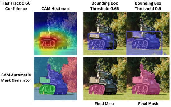 34] and find bounding boxes based on a given bounding box threshold in the resulting CAM heatmap. We make a bounding box, which perfectly makes a box including all pixels that have higher values than the threshold. We then use the bounding box and the image as input for SAM’s prediction method. The resulting mask can be used directly, which we perform for some of our experiments.
