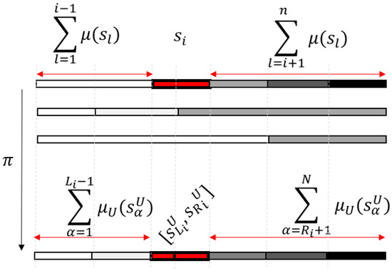 ([14]). Let us consider a normalized measure μ over S, i.e., such that . For any , we call the width of the basic label . Given , the width of H is . The pair , which we also denote as , is called the linguistic perceptual map.