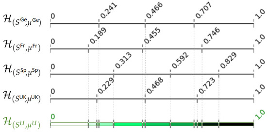 Following the previous examples, let us also consider three newspapers from a different country. To describe the same event considered in Example 3, these three newspapers use the terms = ‘between medium and high’, = ‘very high’, and = ‘medium’. The respective HFLTSs for these linguistic terms are , and . Let us assume that in this country, a different perceptual map is used: and , then and . The centroid of these three news descriptions is . Although the centroid appears to be the same value as the one obtained in Example 3, it is not; this is due to the different perceptual maps used for each country. The common perceptual map is defined by the basics labels , with widths . The projected centroids for the newspapers from the two countries in the common perceptual map are and .