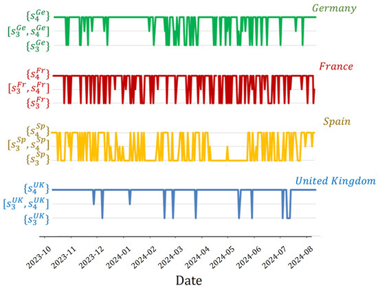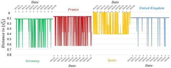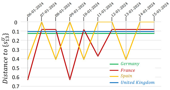 Finally, a sample of the results presented in Figure 3 and Figure 4 is illustrated in Figure 6. For each country, Figure 6 shows the distances of the centroid from the value of the maximum negative sentiment in the common perceptual map during a ten-day period in January 2024.