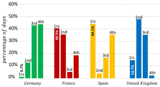 Although Figure 3 might suggest that the UK media outlets are more negative than those of other countries, the common perceptual map reveals that the UK only has the most negative sentiment toward the conflict on 14.71% of the days. In contrast, Spain leads with the highest percentage of days (44.12%) showing the most negative perception, followed by France with 40.52%. Germany, meanwhile, stands out on only two days (24 November 2023, and 8 July 2024) as the country with the highest negative sentiment among those analyzed, but it is also the country that shows the lowest negative sentiment on the greatest number of days. These results are summarized in Figure 5, where the distribution of negative sentiment rankings among the four countries during the Israel–Gaza war is represented.