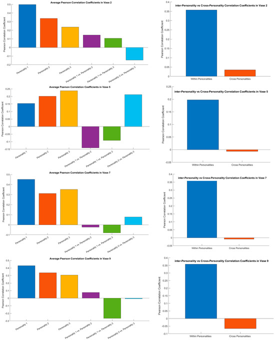 Figure 3 illustrates the outcomes of this analysis across four vase design examples (Vase 2, Vase 5, Vase 7, Vase 9). On the left side of the figure, the mean correlation within each cluster (Cluster 1, Cluster 2, Cluster 3) and between clusters (Cluster 1 vs. Cluster 2, Cluster 1 vs. Cluster 3, Cluster 2 vs. Cluster 3) is presented. On the right side, an overview of the mean correlation within clusters and between clusters across these vase design scenarios is provided, suggesting consistency of design responses within consumer culture based on personality openness traits.