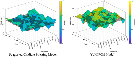 Figure 4 shows the comparison between the suggested model and the reference model in predicting consumer design responses across different designs. The X-axis represents various vase designs, the Y-axis represents design responses, and the Z-axis shows the RMSE.