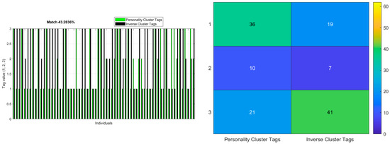 Figure 7, left, illustrates the comparison between the inverse clustering tags and the original personality tags, highlighting discrepancies in the group assignments. The results indicate that the individuals are placed into distinct groups by the inverse clustering method compared to the original personality-based grouping, reflecting a divergence in the clustering patterns.