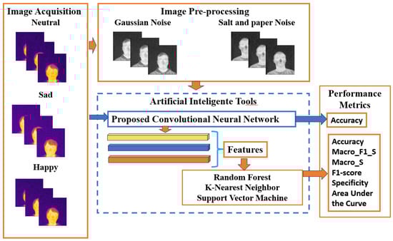 The objective of the work was to accomplish a comparative study on two subsets of methods belonging to the field of artificial intelligence (AI), i.e., certain algorithms belonging to machine learning and deep learning (KNN, SVM, RF and CNN), applied to the two categories of images presented above (augmented images with Gaussian and “salt and pepper” noise) in order to obtain favorable results regarding the multiclass classification process, in the three emotional states/classes presented above, i.e., neutral, happy and sad.