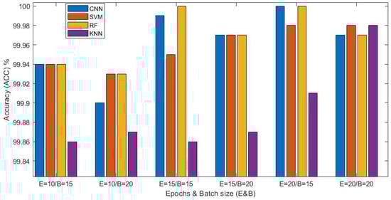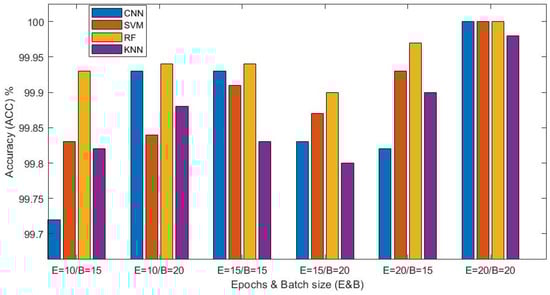Table 2—images with Gaussian noise), with an accuracy (ACC) of 100%, were obtained through the CNN and RF algorithms. The software application was configured with 15–20 epochs and a batch size of 15. In the case of the RF algorithm, it seems to be sufficient to configure the application with 15 epochs and a batch size of 15, to obtain an accuracy percentage (ACC) of 100%.