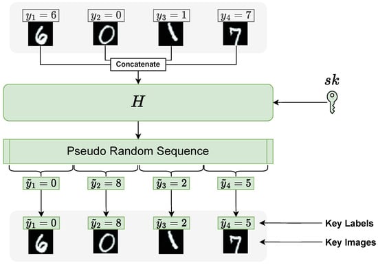 RoSe method applied to the MNIST dataset for trigger set generation. The four images at the top of the figure are the inputs sampled from the training set with their native labels, . The images are concatenated and given to a hash function, H, parametrized by a secret key, . The output is a pseudo-random sequence that generates the new labels, , forming the key images and labels.
