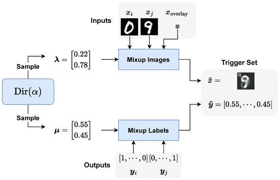 Mixer method applied to the MNIST dataset for trigger generation with . From a Dirichlet distribution parameterized by , two vectors are generated, and , that are used to mix up, respectively, and to generate .