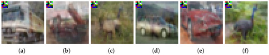 where is an additive overlay added to the Mixup sample to enhance secrecy, and ensures that the pixel values remain within valid limits. These Mixer samples form the set of inputs . Figure 3 shows an example of samples from the trigger set generated as described previously. As an example, Figure 3d is a mixed sample between a car, , and a horse, , where .