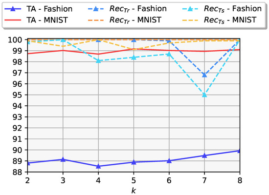 TA, , and computed according to different values of k for FashionMNIST and MNIST.