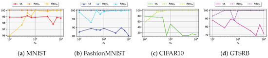 The results are shown in Figure 4 for k and Figure 5 for . For the k plots, we omitted some datasets with similar behavior to conserve space. The watermark recovery rates, and , are measured based on the sizes of the watermark datasets, and , respectively. For , we performed experiments with . The TA of each model without a watermark can be found in Figure Table 1. To determine the optimal , we plotted the accuracy of the model as a function of and selected the value that produced the highest TA and . The best k was 2 for MNIST, FashionMNIST, and CIFAR-10, and 7 for GTSRB. Additionally, starting from , both TA and showed significant improvement and stabilized across all datasets. However, increasing the value of significantly decreases TA probably because the task related to the watermark takes more importance compared to the main task in the learning process, leading to a task interference [39] in which we note a decrease in performance on the main task for complex problems (e.g., Figure 5c). As a result, we used for the remaining experiments.