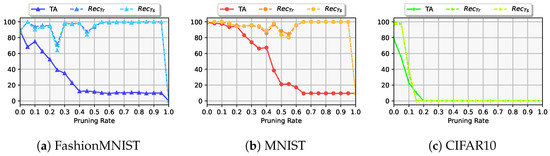 Pruning evaluations (Figure 6) further validate RoSe-Mix’s robustness. While MNIST and FashionMNIST experience 30% and 90% TA reductions at a pruning rate of , their respective watermark recovery rates remain higher than 80% for both. In contrast, CIFAR-10 suffers greater TA drops (to 55% and 40%) at pruning rates of 0.1, yet remains higher than or comparable to TA. This suggests that while pruning reduces the model’s expressiveness, it does not completely remove the watermark. The interplay between Mixup-generated triggers and deep feature representations ensures that the watermark remains embedded even when substantial portions of the network are removed.