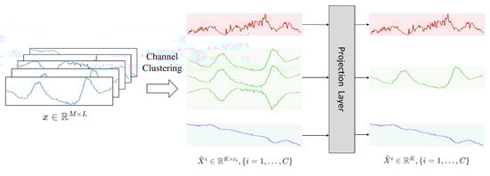 After channel clustering, the channels are grouped into C clusters. Each cluster i contains channels and can be denoted as . Channels with high similarity undergo joint embedding, enabling the model to exploit intrinsic connections and realize enhanced predictive accuracy. For other variants, we apply a channel-independent strategy that allows these channels pass through the projection layer independently, which reduces the influence of irrelevant data and improves the model’s generalization ability. The output of the channel clustering module is represented as .