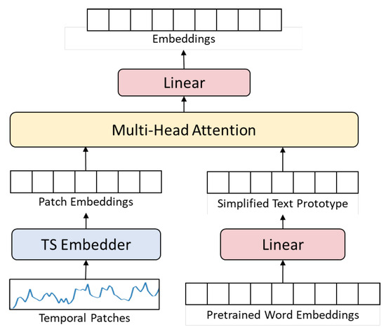 The scheme uses a multihead cross-attention layer to align the time series patch with the pretrained word embeddings in the LLM backbone network, where V denotes the size of the vocabulary and D is the hidden dimension of the backbone model. To reduce the space required for reprogramming, we maintain a small set of textual prototypes, denoted as , where . The prototypes are obtained using learnable linear projections.