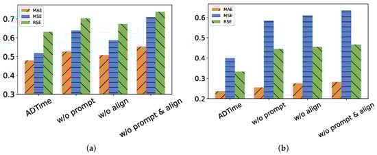 Embedding Variants. In order to better understand the effectiveness of the embedding construction module design in ADTime, we constructed three variants of the model and conducted ablation experiments on the ETTh and PI datasets. The experimental results illustrated in Figure 5 demonstrate that removing either the modality alignment or the prompt module leads to diminished time series forecasting capability on the part of LLMs. Text-aligned ablation indicates that eliminating gaps between the text space and temporal data space leads to better prediction results than simple splicing. The degradation of prediction results in the absence of prompts also validates the significance of prompts in guiding the prediction task.