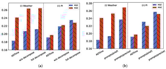 Ablation study of model design: (a) decomposition module ablation experiment on the ETTh and PI datasets and (b) prompt variants on the ETTh and PI datasets.