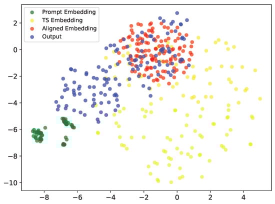 T-SNE Visualization. Figure 7 presents the T-SNE visualization of the embedding process for the ETTh dataset at different stages of the multimodal learning pipeline consisting of series and prompt embeddings. Initially, the series embedding shows a sparse distribution of data points, indicating a lack of structured correlation in the time series data. In contrast, prompt embedding exhibits a more compact distribution with the data points clustered together, reflecting the strong correlations established through the prompt-based approach. After the alignment process, the embeddings from both the time series and the prompt overlap closely, demonstrating that text alignment successfully bridges the gap between the temporal and textual spaces. This result confirms the effective integration of time series and prompt embeddings, enhancing the model’s ability to leverage both modalities in a unified manner.