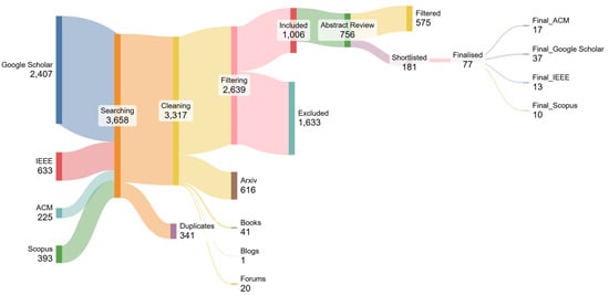 We individually inspected the titles and decided to remove 250 articles, and 756 results were shortlisted for the next step of reviewing abstracts. During the secondary screening, papers that passed the initial screening were reviewed in greater depth by examining the abstract, introduction, and conclusion sections to assess the authors’ objectives and contributions. In this step, we carefully analyzed the abstract and title of each paper to determine its alignment with our research questions. After manually reviewing each paper and evaluating its domain and research focus, initially, 181 papers were identified and shortlisted based on our established inclusion and exclusion criteria. We re-examined and re-evaluated the dataset to determine the significance of each study after refining our research questions. Ultimately, 77 papers were deemed directly aligned with the updated research questions and were incorporated into the final analysis, and the remaining papers were excluded due to their limited relevance to the revised scope of our study. Figure 2 below depicts the flow of the systematic review.
